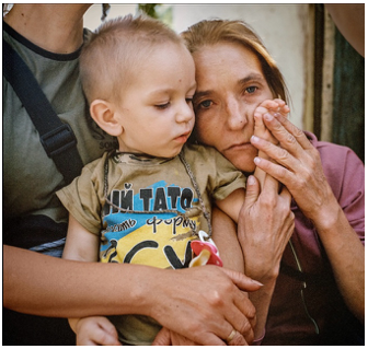 Der kleine Junge trägt ein T-Shirt mit der Aufschrift: Mein Papa dient in den ukrainischen Streitkräften.