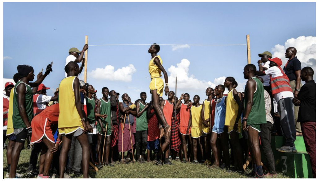 Auch die Massai haben eine Olympiade! Einst musste jeder junge Mann mit 18 Jahren in die Wildnis gehen und einen Löwen mit einem Messer töten. Nun gibt es nicht mehr genug Löwen, vielleicht auch nicht mehr genug Massai. Heute treten sie in sechs Kategorien an: Werfen von Speeren und Langholz, Hochsprung und 200-, 800- und 5000-Meter-Lauf.