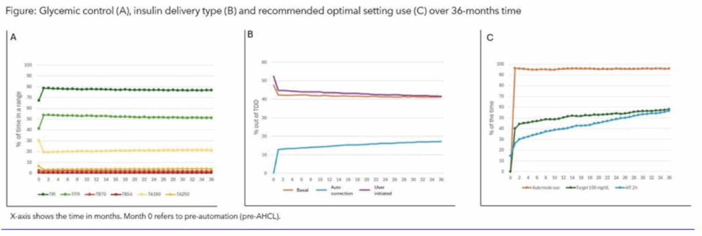 Der durchschnittliche Prozentsatz der vom Anwender abgegebenen Insulinmenge sank von 52,4 % zu Beginn der Studie auf 44,8 % und sank im Laufe der Zeit weiter auf 41,5 % ab. Die Menge des automatisch abgegebenen Bolus-Insulins stieg schnell von null zu Beginn der Studie auf 12 % nach einem Monat und stieg im Laufe der 36 Monate weiter an. In diesem Zusammenhang sank die Anzahl der vom Anwender initiierten Boli von 5,6 pro Tag zu Beginn der Studie auf 4,8 pro Tag und blieb über 36 Monate relativ konstant. Nach drei Jahren verabreichte das System den größten Teil des Insulins automatisch, was die Belastung für die Anwender durch weniger selbst initiierte Boli und ein größeres Vertrauen in das System reduzierte.
