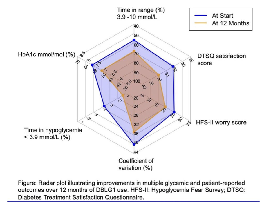 Bisher liegen eher wenige Real-World-Daten zur Nutzung des DBLG1- Systems bei Erwachsenen mit T1D vor, M. Lytrivi (OP09-53) berichtete Daten zur Glucosekontrolle von Patienten vor und nach dem Beginn der Nutzung dieses AID-Systems. In diese prospektive Kohortenstudie wurden Erwachsene mit T1D, die zwischen Mai 2022 und September 2023 mit der Verwendung des DBLG1-Systems begonnen hatten, in 12 spezialisierten Diabeteszentren in Belgien aufgenommen. Klinische Daten und CGM-Daten wurden zu Beginn der Studie sowie nach 4, 8 und 12 Monaten erhoben. Der primäre Endpunkt war die Veränderung der TIR (Glucose 3,9–10,0 mmol/l) vom Beginn bis zum 12. Monat.
