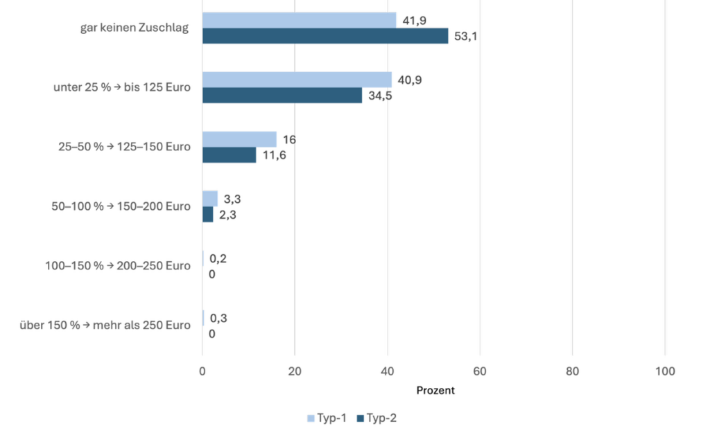 Ein weiterer großer Anteil ist bereit, zumindest einen moderaten Zuschlag zu akzeptieren. So würden 40,9 % der Menschen mit Typ-1-Diabetes und 34,5 % der Menschen mit Typ-2-Diabetes einen Zuschlag von unter 25 % (bis etwa 125 Euro monatlich) akzeptieren. Zusammengenommen zeigt sich damit, dass rund 80 % der Befragten entweder gar keinen oder nur einen geringen Zuschlag in Betracht ziehen.